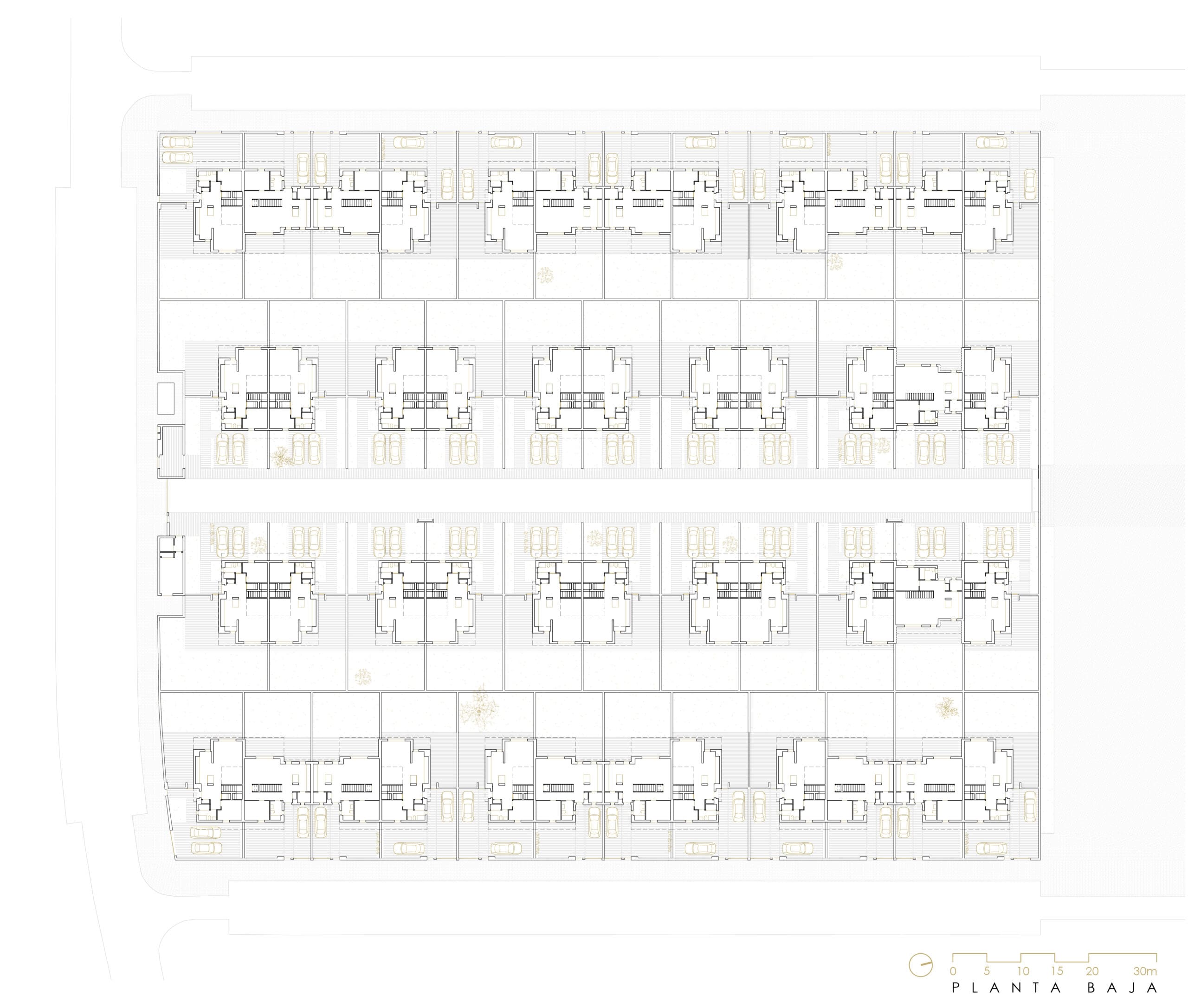 El proyecto, con normativa de viviendas unifamiliares agrupadas, resuelve las 46 viviendas en combinaciones de 2, 3 y 4 unidades, estandarizando la solución de vivienda a sólo dos tipologías, vivienda de esquina y central.