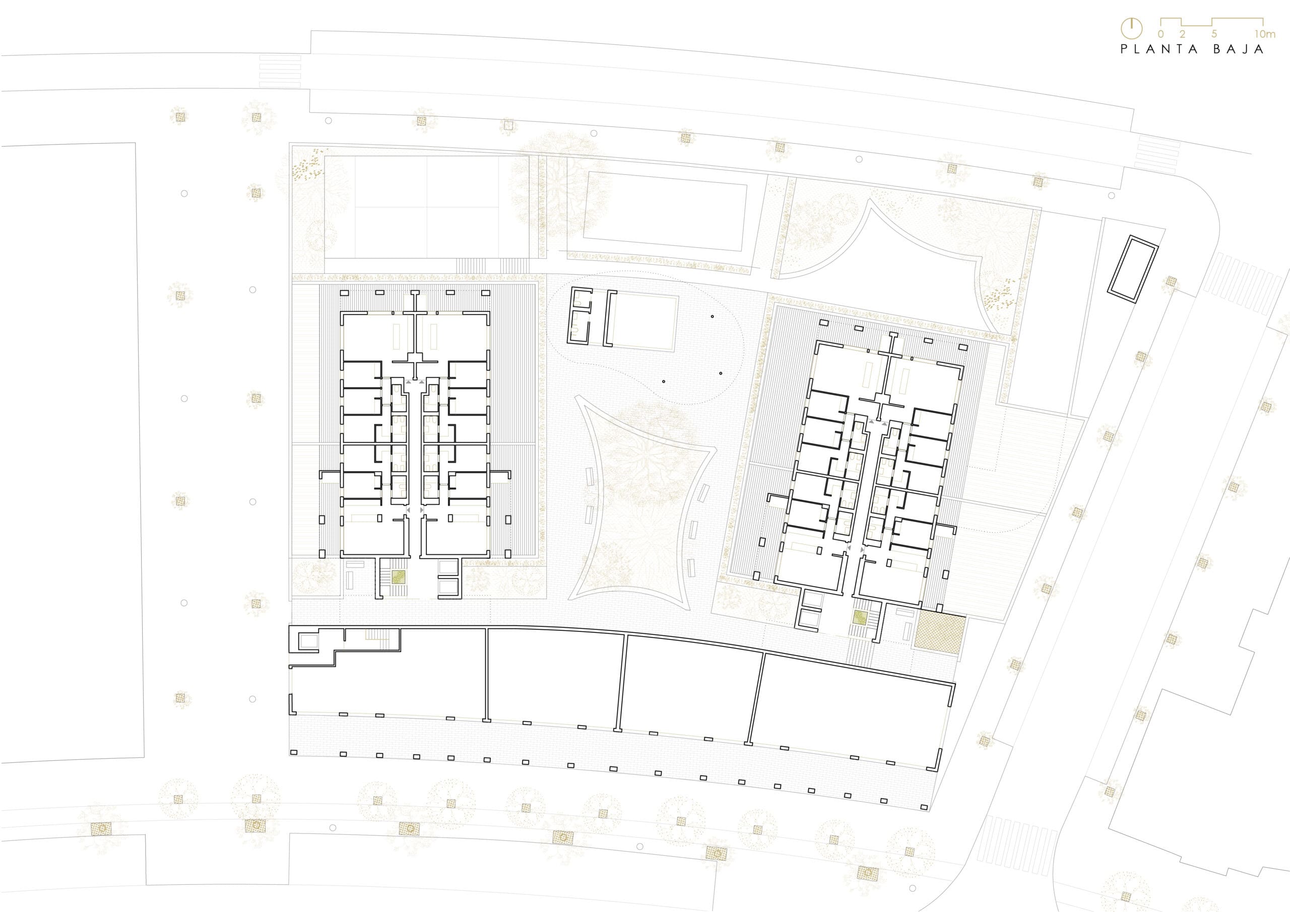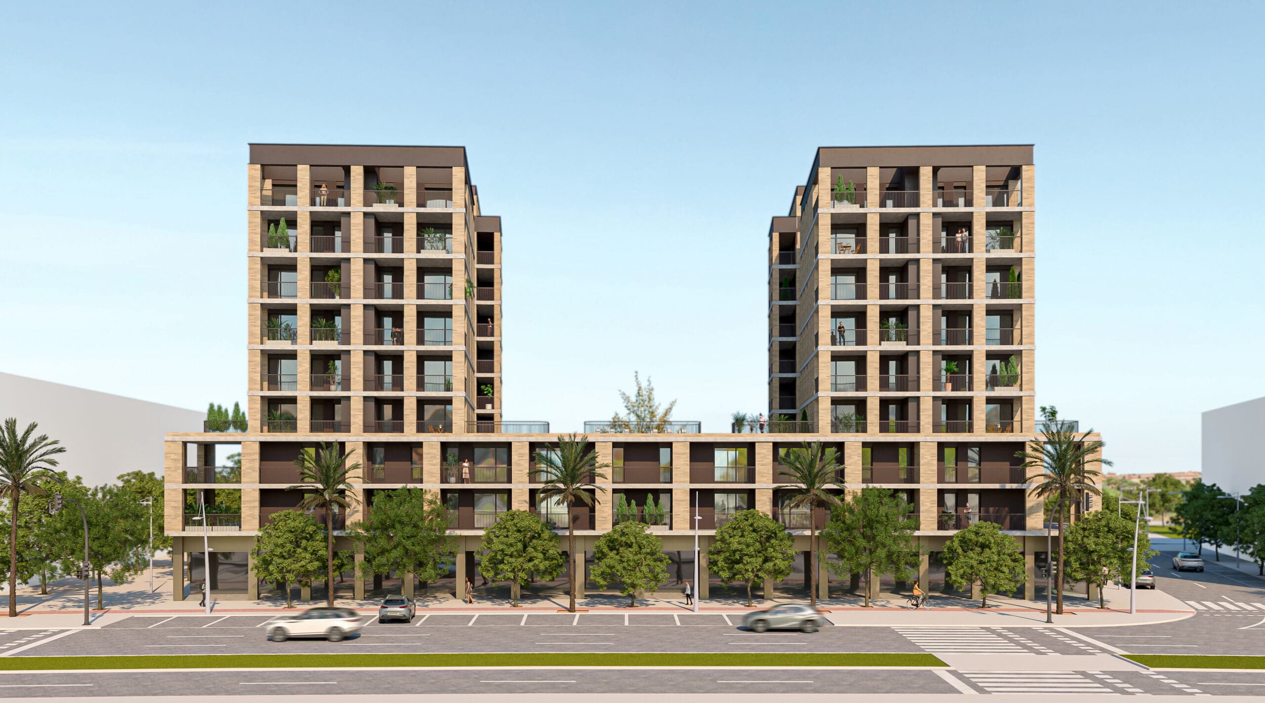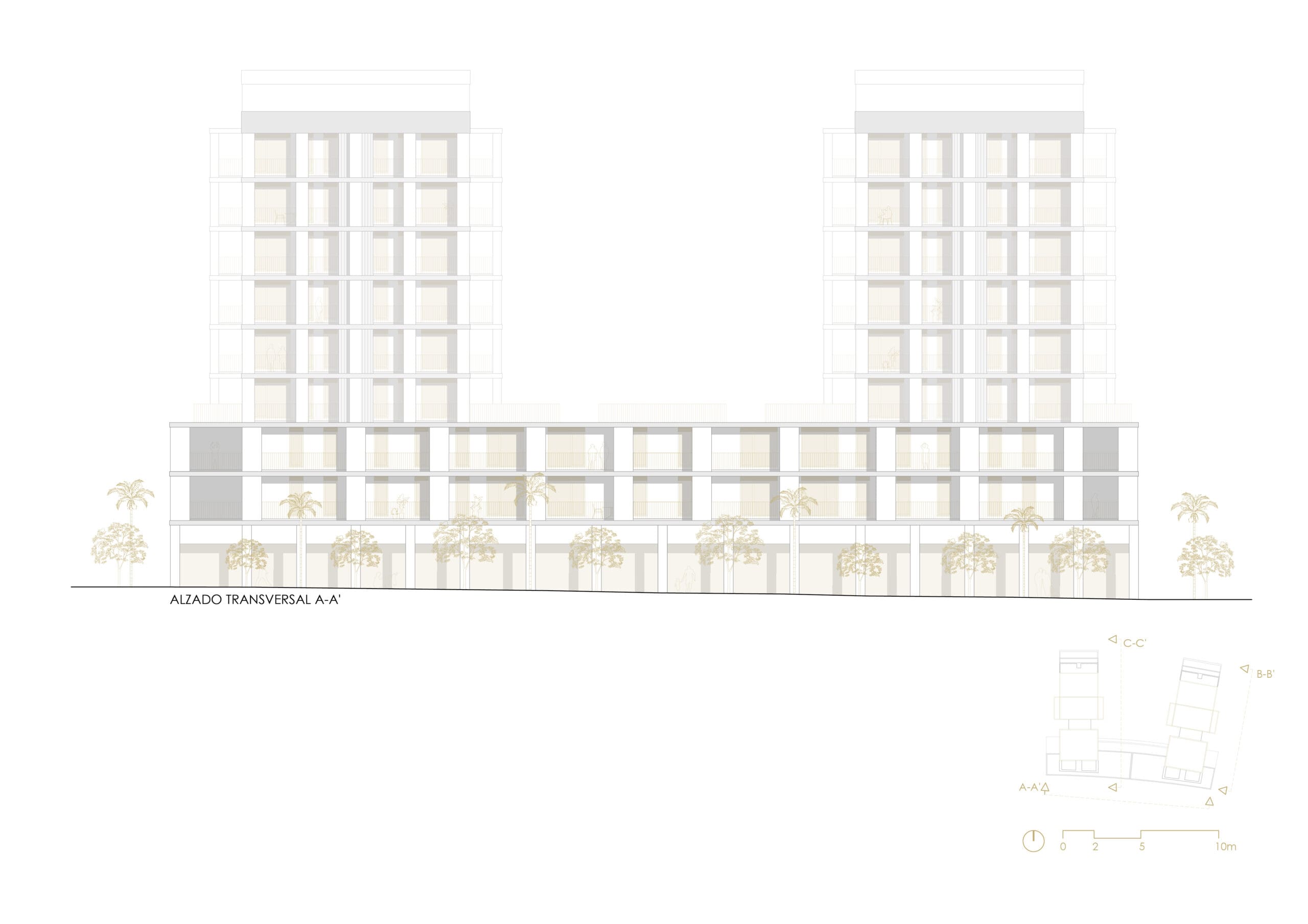 Aprovechando la normativa, se construye un volumen de solo B+2 hacia la avenida principal para potenciar las vistas de las viviendas superiores y crear una gran permeabilidad visual hacia las zonas comunes y la avenida. Se maximizan el número de áticos escalonando la edificación en B+9. El bajo rasante se resuelve en una única planta, no colmatando totalmente la parcela, permitiendo ubicar la piscina e introducir vegetación de mayor porte.