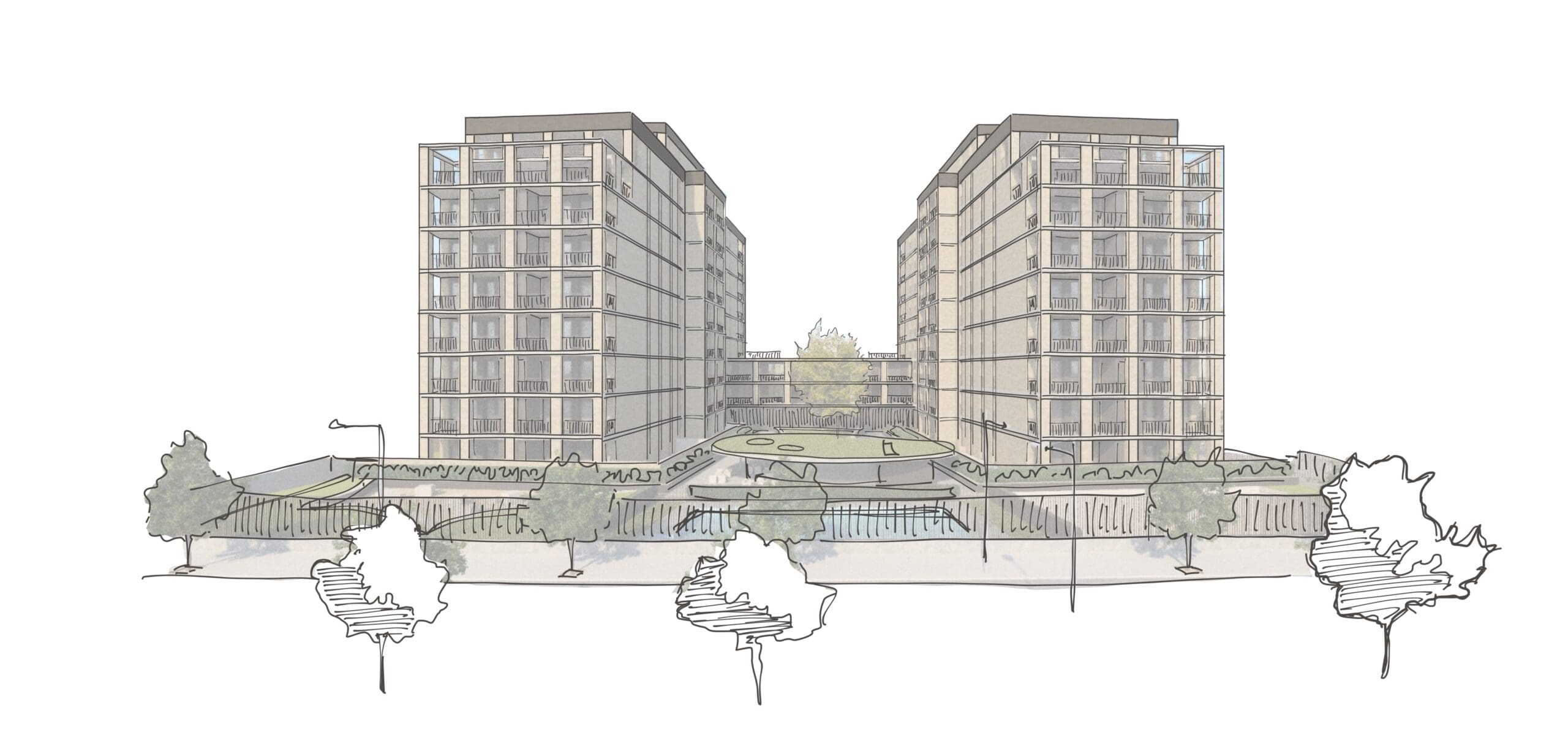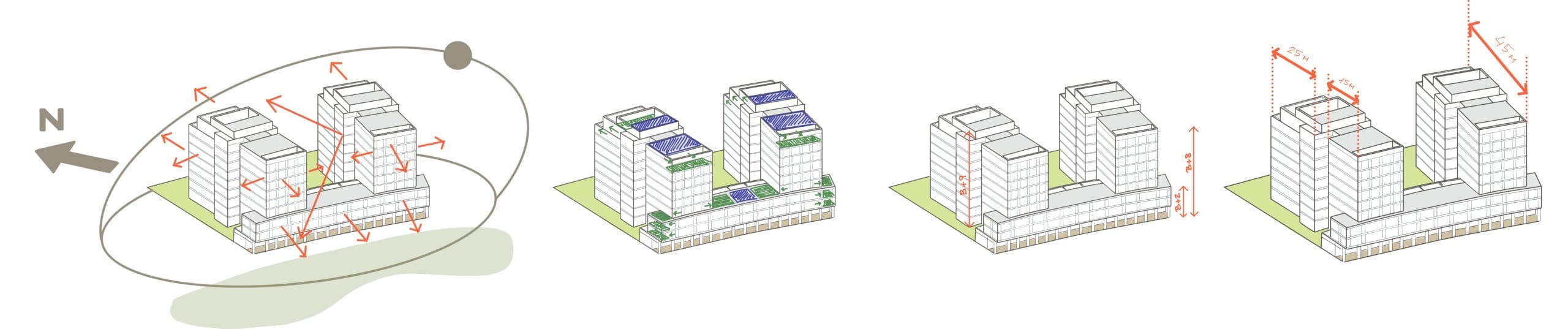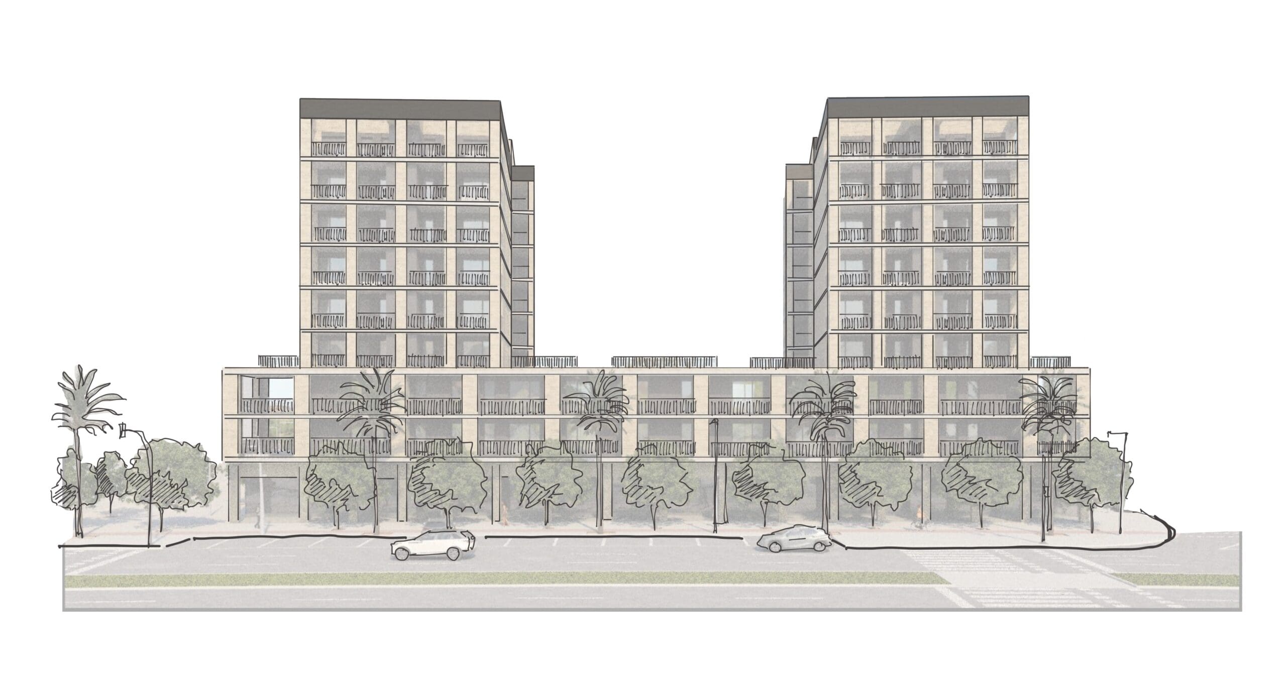 Aprovechando la normativa, se construye un volumen de solo B+2 hacia la avenida principal para potenciar las vistas de las viviendas superiores y crear una gran permeabilidad visual hacia las zonas comunes y la avenida. Se maximizan el número de áticos escalonando la edificación en B+9. El bajo rasante se resuelve en una única planta, no colmatando totalmente la parcela, permitiendo ubicar la piscina e introducir vegetación de mayor porte.