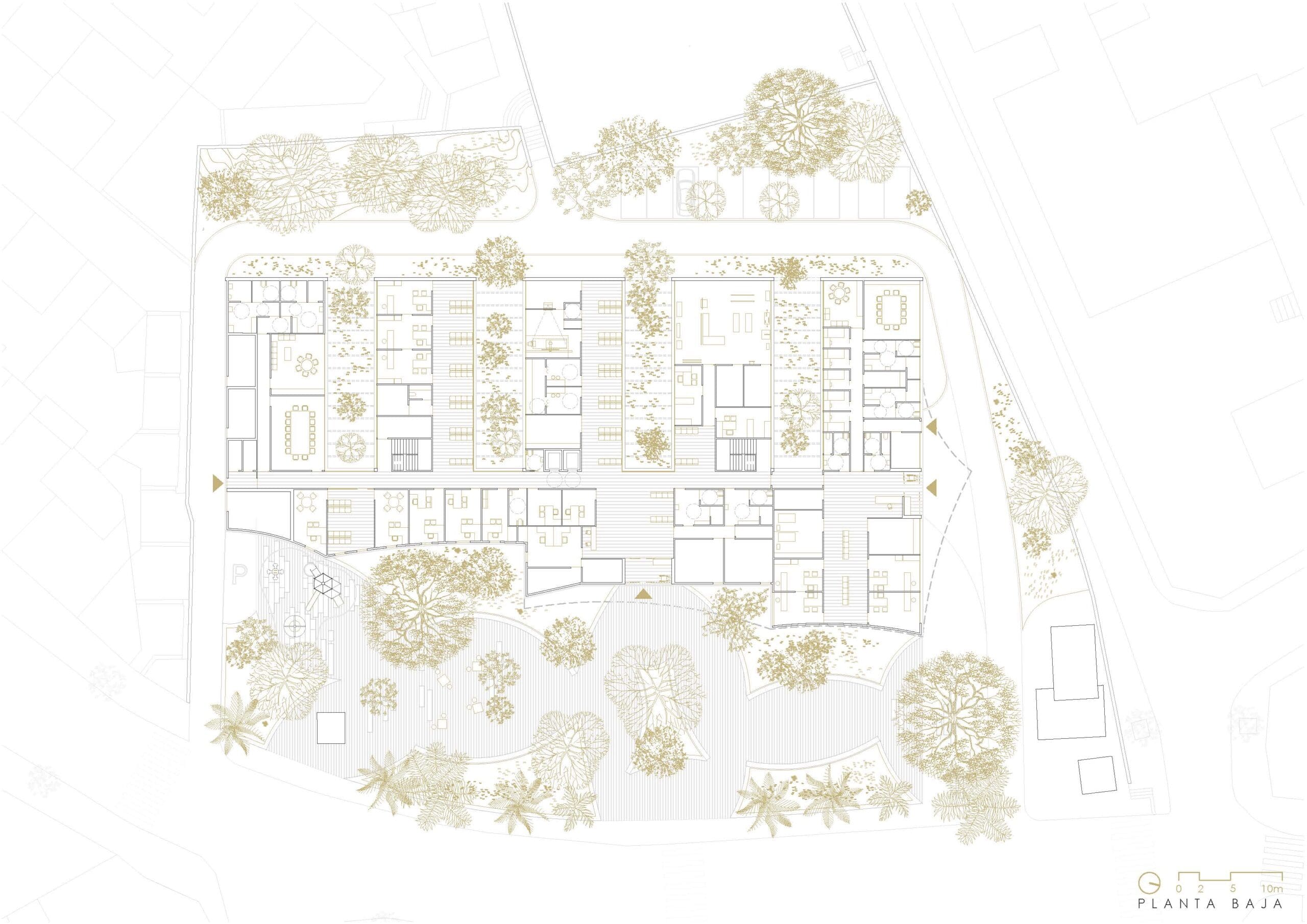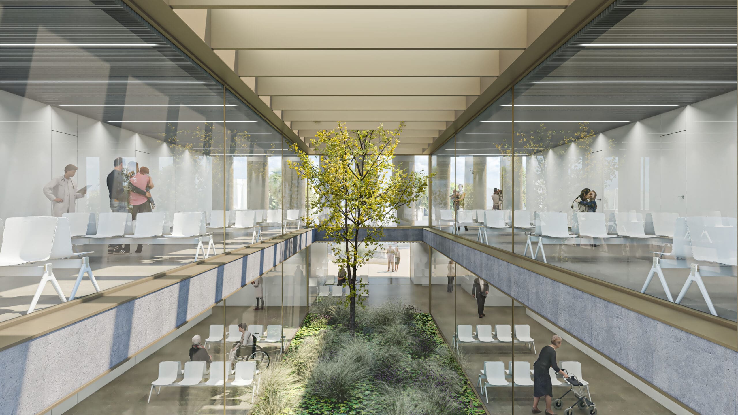 La elección de la tipología asistencial en ‘peine’ no ha estado únicamente motivada por la funcionalidad, sino que también permite fragmentar el programa y organizarlo en torno a unidades de menor escala. La estructura en ‘peine’ permite la creación de una secuencia de patios que dan lugar a un paisaje interior amable.