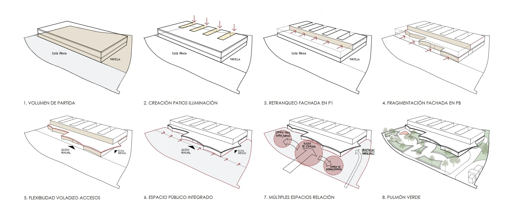 Una nueva ágora para Vejer, un nuevo centro de salud volcado a la ciudad. El innegable valor de la plaza pública desde la cual tiene acceso el centro de salud hace que sea de vital importancia su relación con este. El volumen del edificio responde a esta premisa, generándose un edificio de dos plantas en forma de peine cuya fachada principal responde a dos estrategias. En primer lugar, en planta primera se retranquea la fachada de manera pronunciada, difuminándose así la altura total del edificio. En segundo lugar, en planta baja la fachada se fragmenta y busca que, con las suaves formas generadas, el volumen se integre con la plaza.