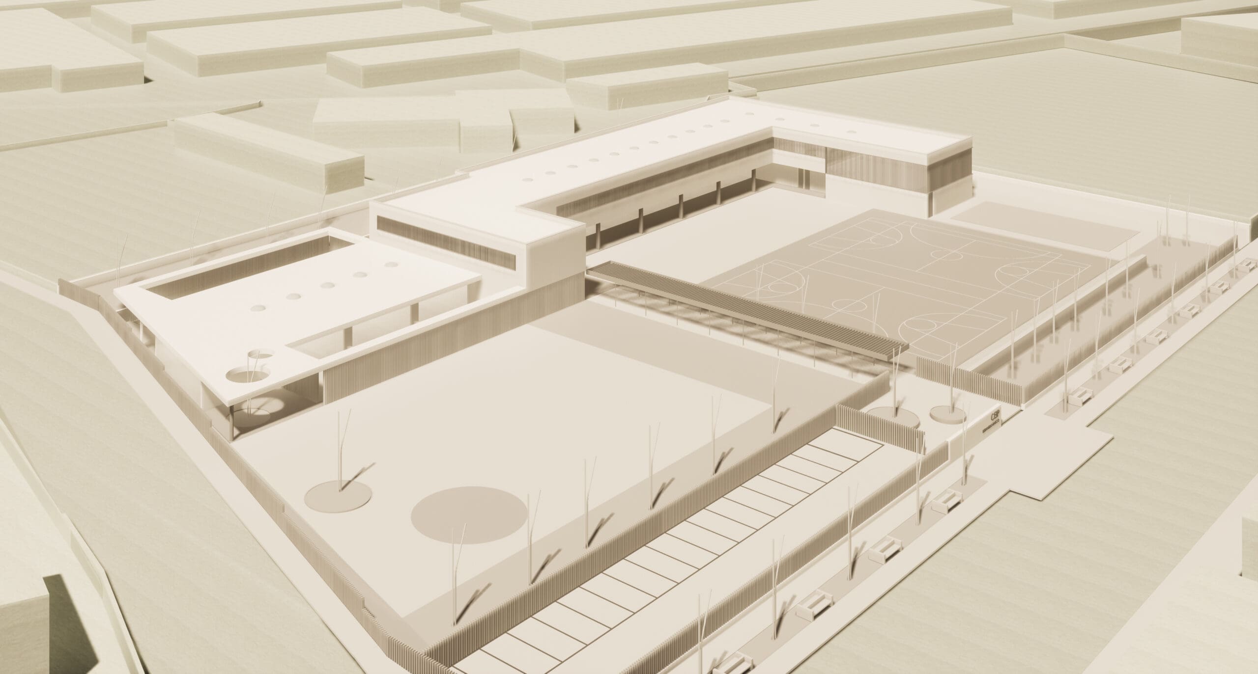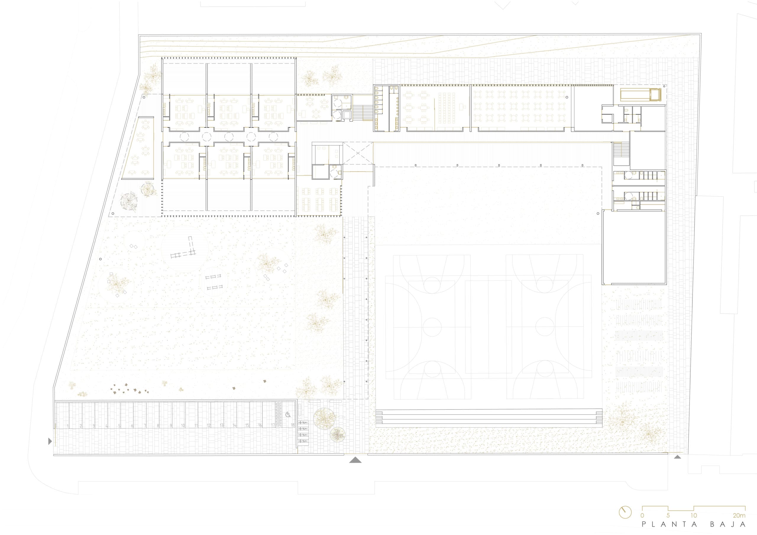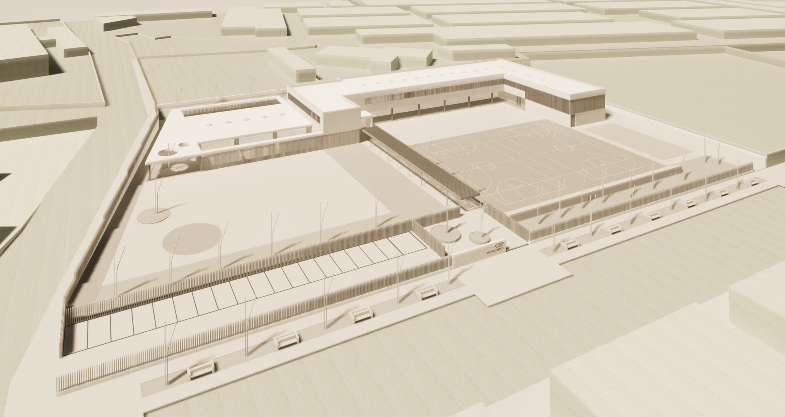 El centro educativo se proyecta en el fondo de la parcela, sobre los actuales espacios exteriores, procurando que su huella respete los edificios existentes y permitiendo el traspaso de la actividad académica entre el nuevo edificio y el existente.