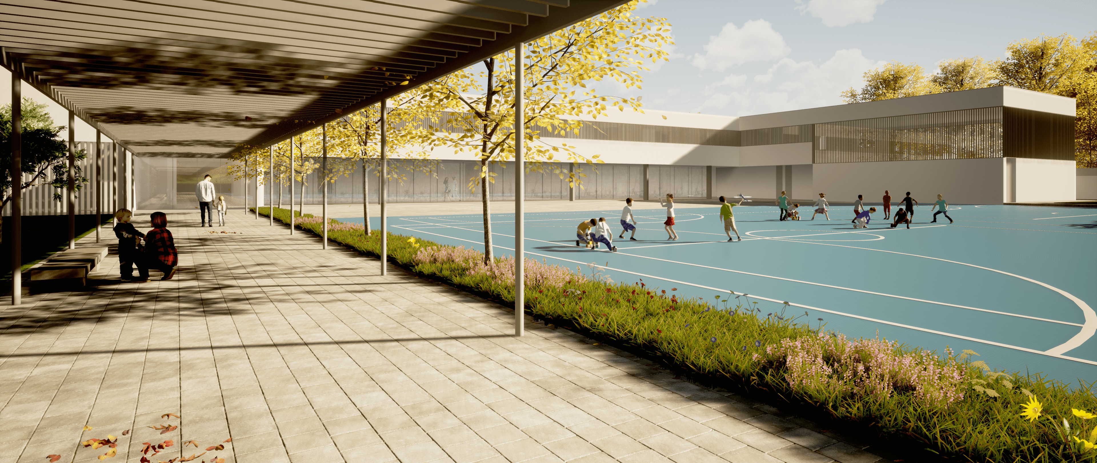 La zona de juegos infantil se ubica en torno al ala de infantil, desde donde se dispone una salida independiente a través de un pequeño porche exclusivo para esta zona. Al otro lado del paseo se ubica la zona de juegos de primaria, delante del gran porche que recorre la galería de planta baja y genera un espacio de sombra permitiendo el juego en épocas estivales o de lluvia.