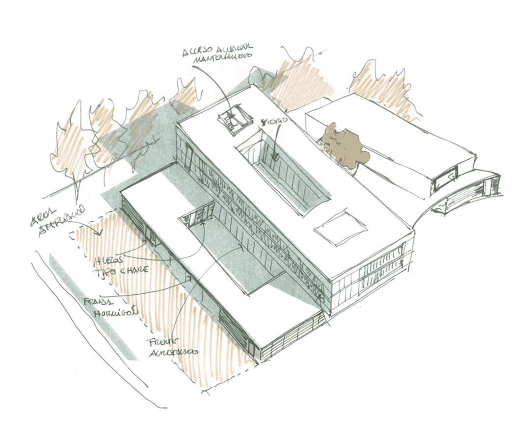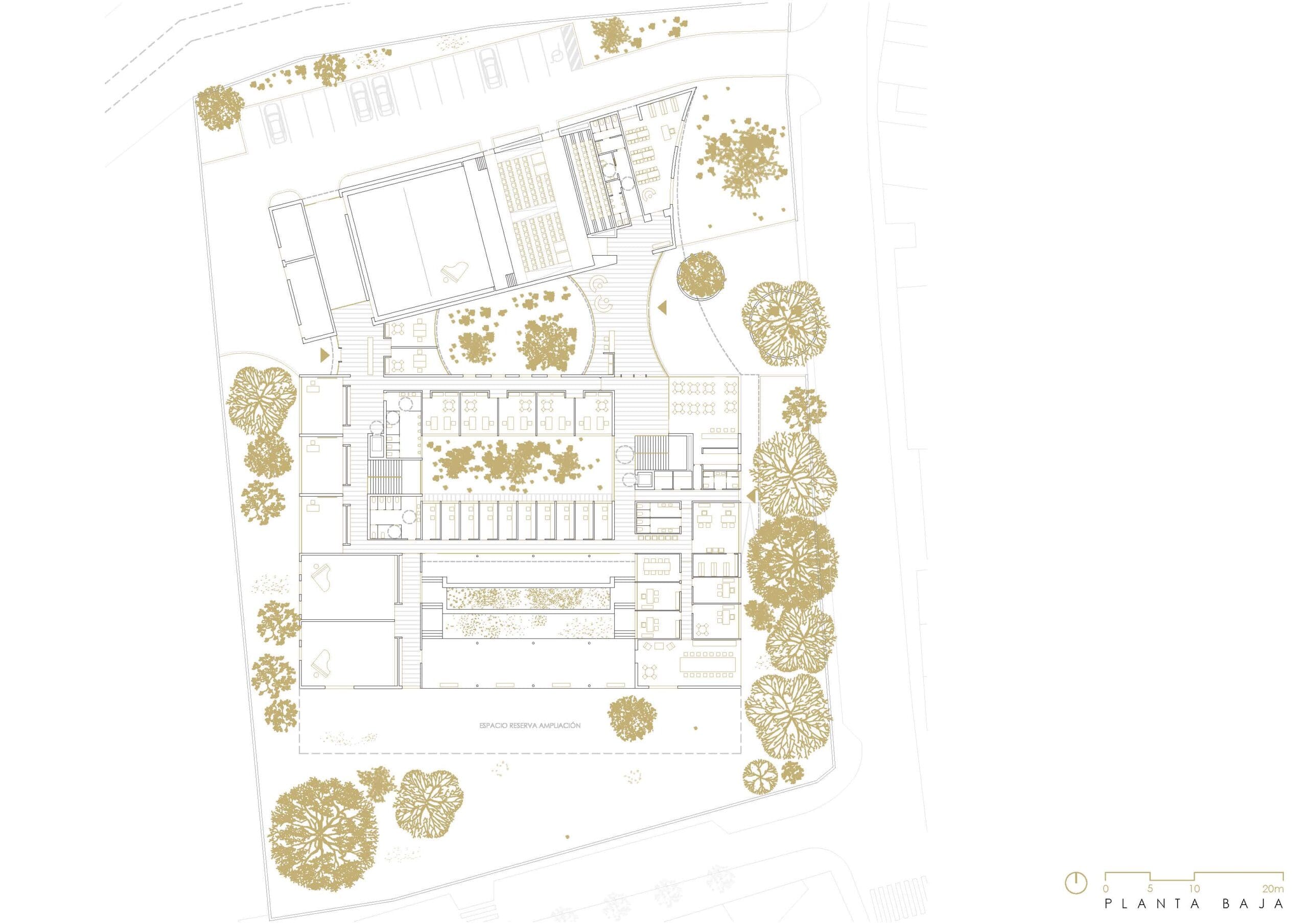 Una de las premisas de diseño es clarificar los usos y relacionar el programa desde un espacio charnela. Ello permite simplificar los recorridos, racionalizar los accesos, minimizar la huella en el paisaje y la economía en la construcción. Por otro lado, la consecución de los tres patios, que ordenan la planta, permite una transparencia, comprensión y lectura evidente, pero controlada, de los espacios; incluso en planta baja, que la gran transparencia propuesta pueda relacionarlos visualmente entre ellos.