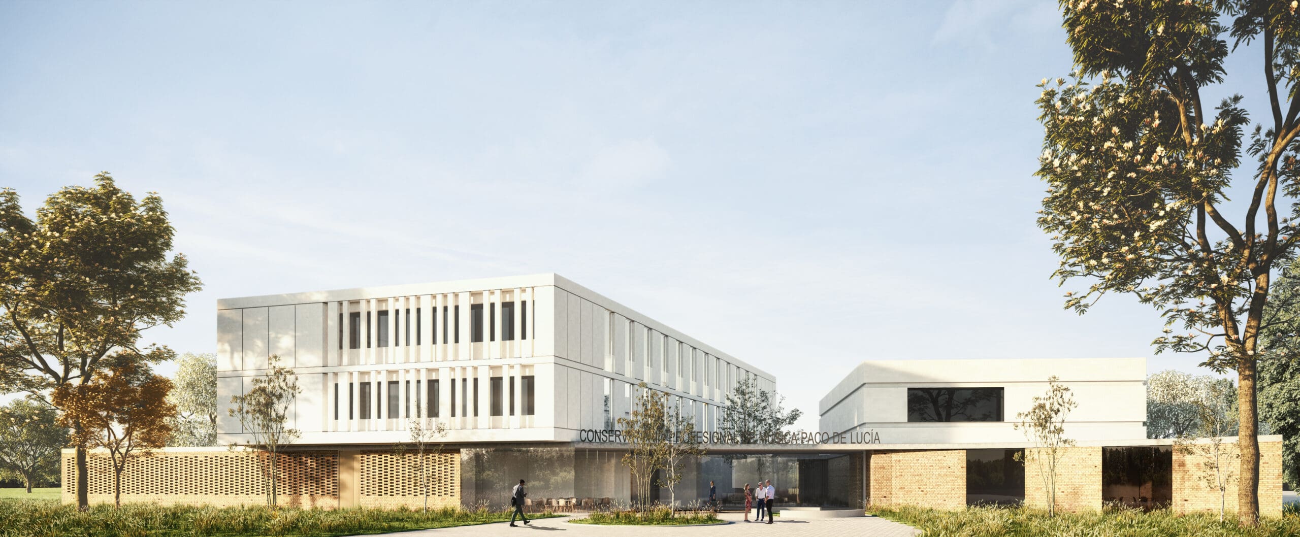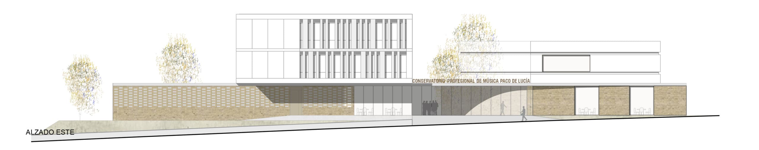 El nuevo Conservatorio Profesional de Música “Paco de Lucía” se organiza en dos volúmenes claramente diferenciados, unidos por un basamento común, que independiza los usos más públicos (auditorio, biblioteca y cafetería) respecto a los usos más privados (docente y administrativo). El nexo de estos volúmenes es el gran hall de entrada que articula la circulación entre las diferentes áreas funcionales y conecta con las plantas superiores mediante un núcleo de comunicación vertical principal del edificio.