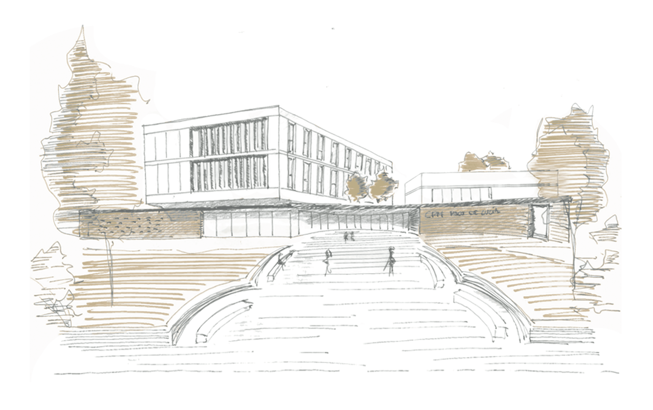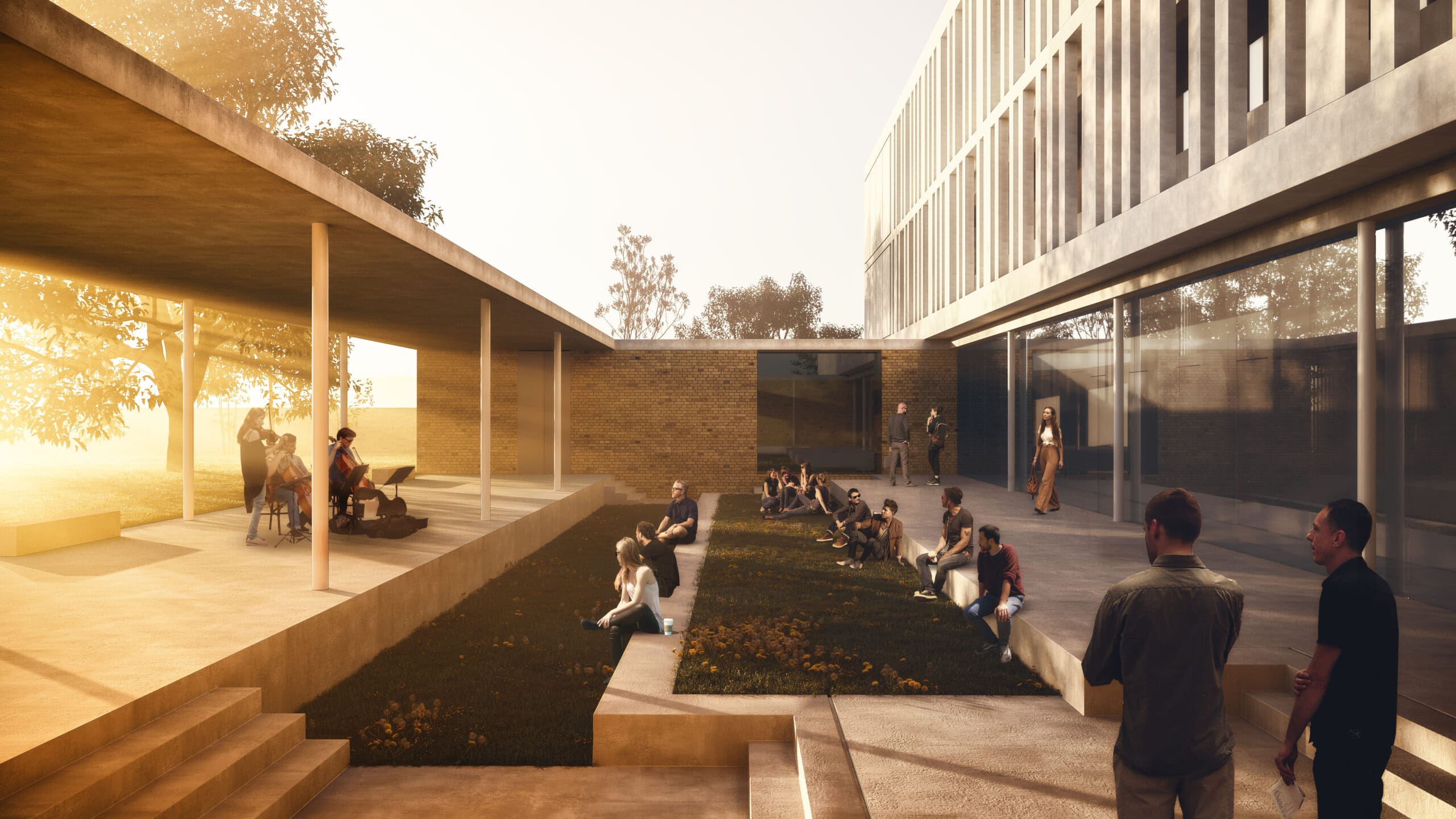 Entre estos volúmenes, se crean una sucesión de patios que se abren y se utilizan por el público. Un primer patio se sitúa en la pieza “charnela” entre los distintos usos y en relación directa con el hall, creando un fondo de escena. Un segundo patio que se sitúa en el aulario articulando en torno a sí todas las circulaciones. Un tercer patio de interacción sirve de punto de encuentro para los usuarios y su diseño permite la celebración de conciertos y eventos al aire libre.