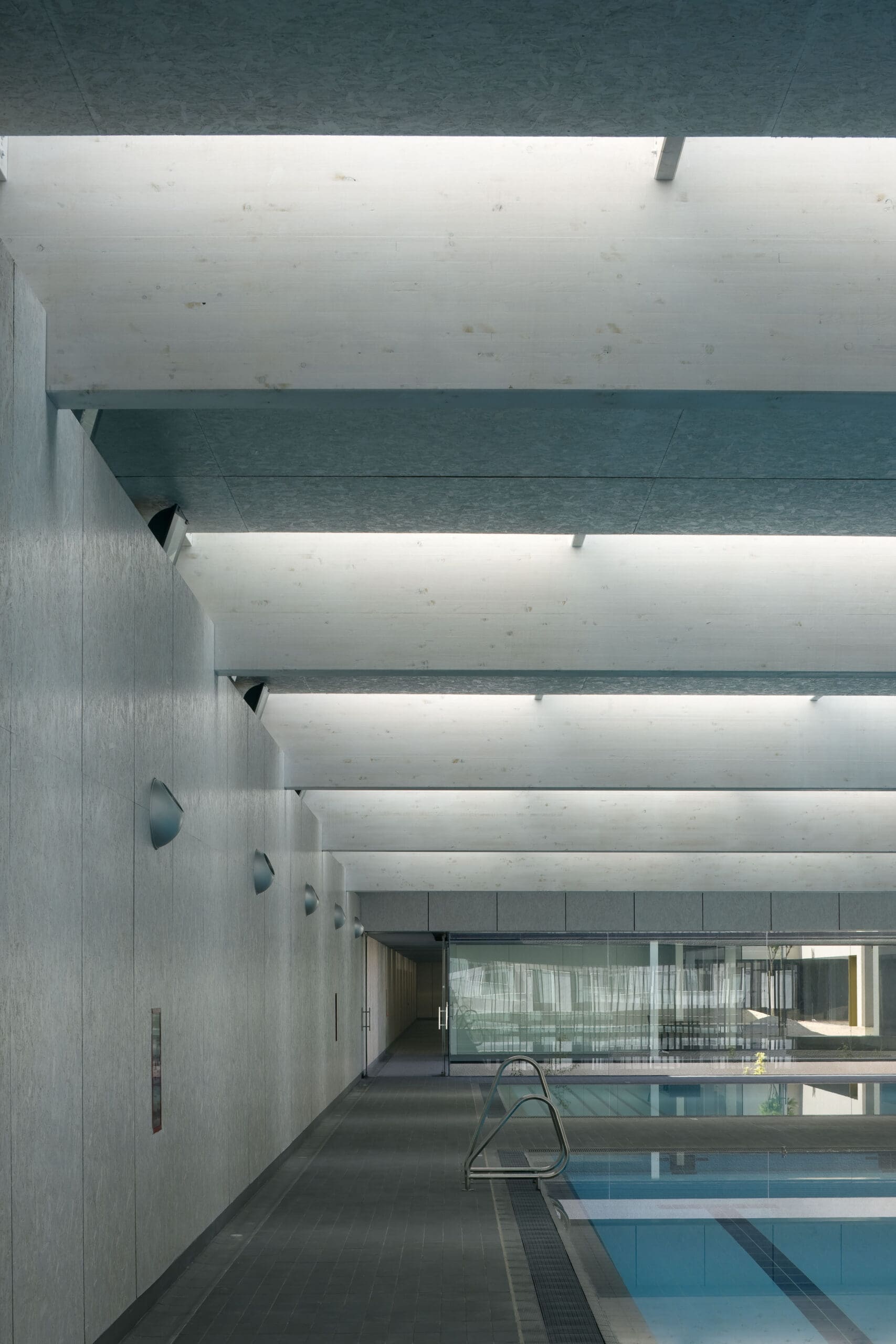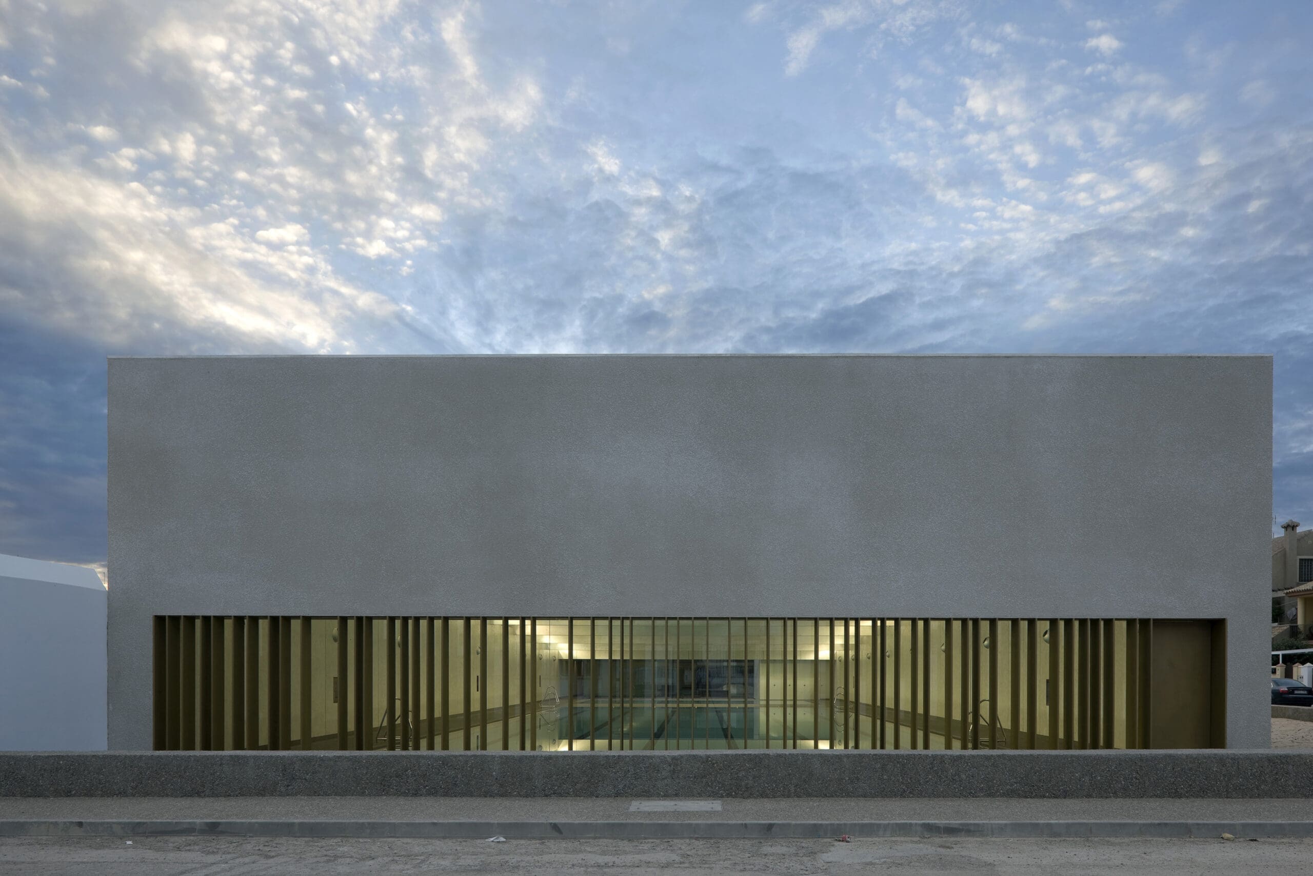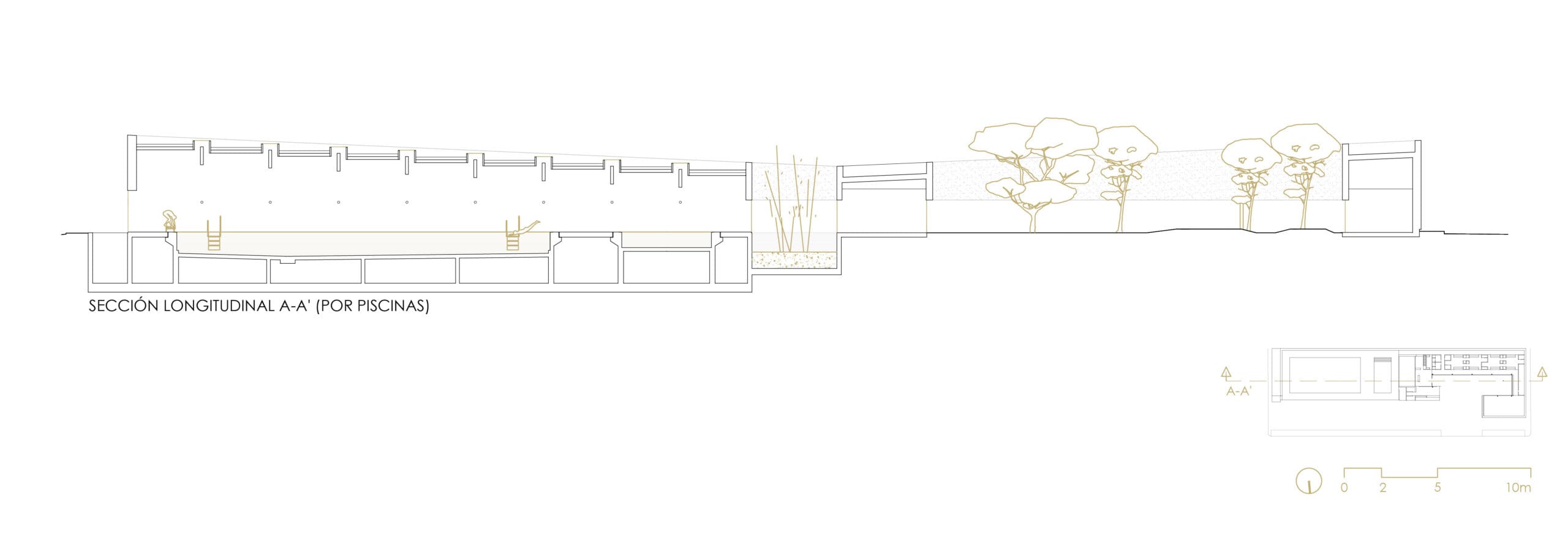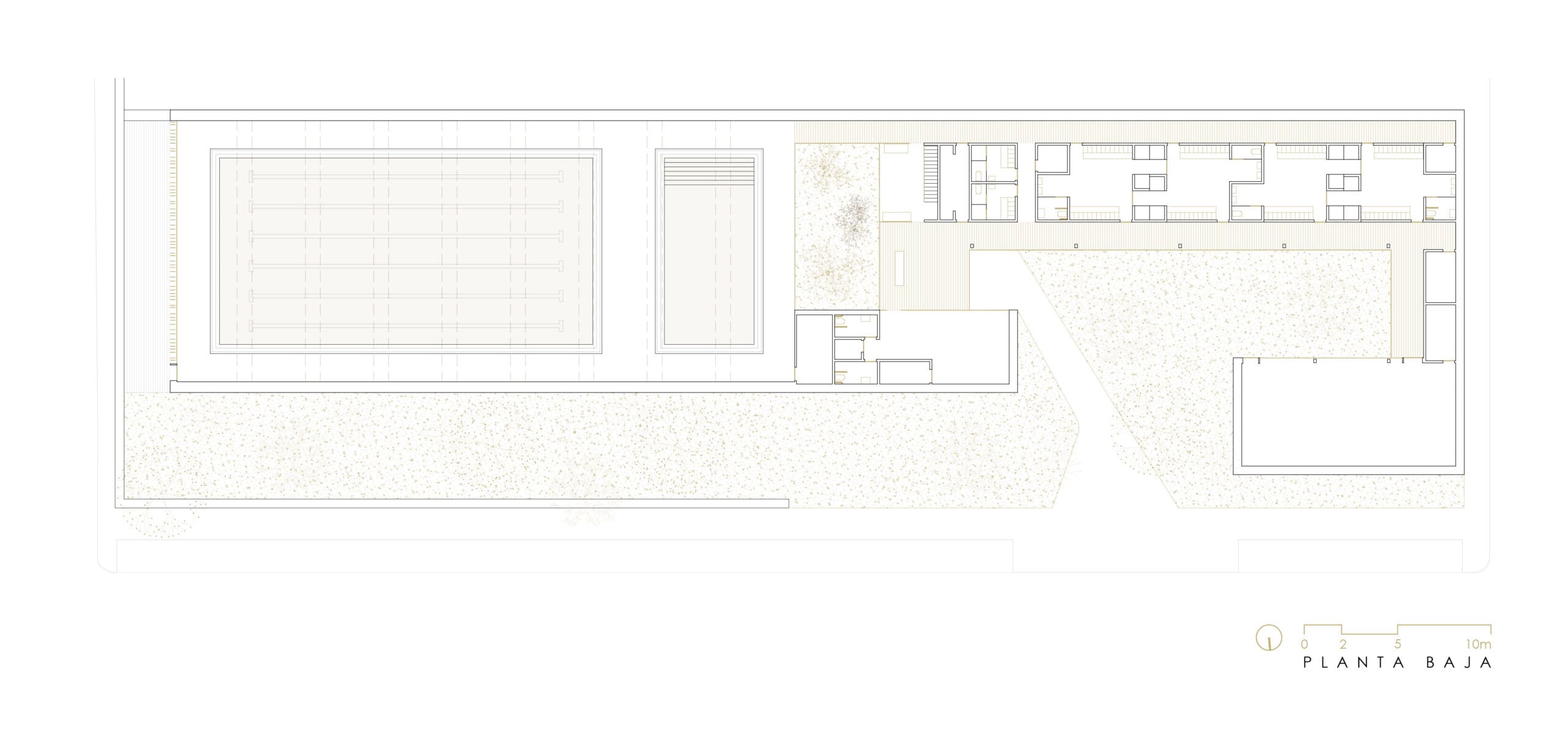 Las diversas funciones del programa giran en torno a la primera zona de acceso y control, optimizando sus recorridos y áreas de transición. Las piezas edificadas están diseñadas con diferentes grados de permeabilidad e intimidad, permitiendo disposiciones generosas y registros para el conjunto. En el extremo Oeste se encuentran los vestuarios, administración, control y una sala deportiva, organizados alrededor del vestíbulo y un patio que filtra y proyecta hacia el exterior. En el lado Este, se ubica el volumen de las piscinas, concebido como un espacio diáfano iluminado con la calidez de sus paredes y vigas blancas, que permiten acoger las amplias luces del pabellón.