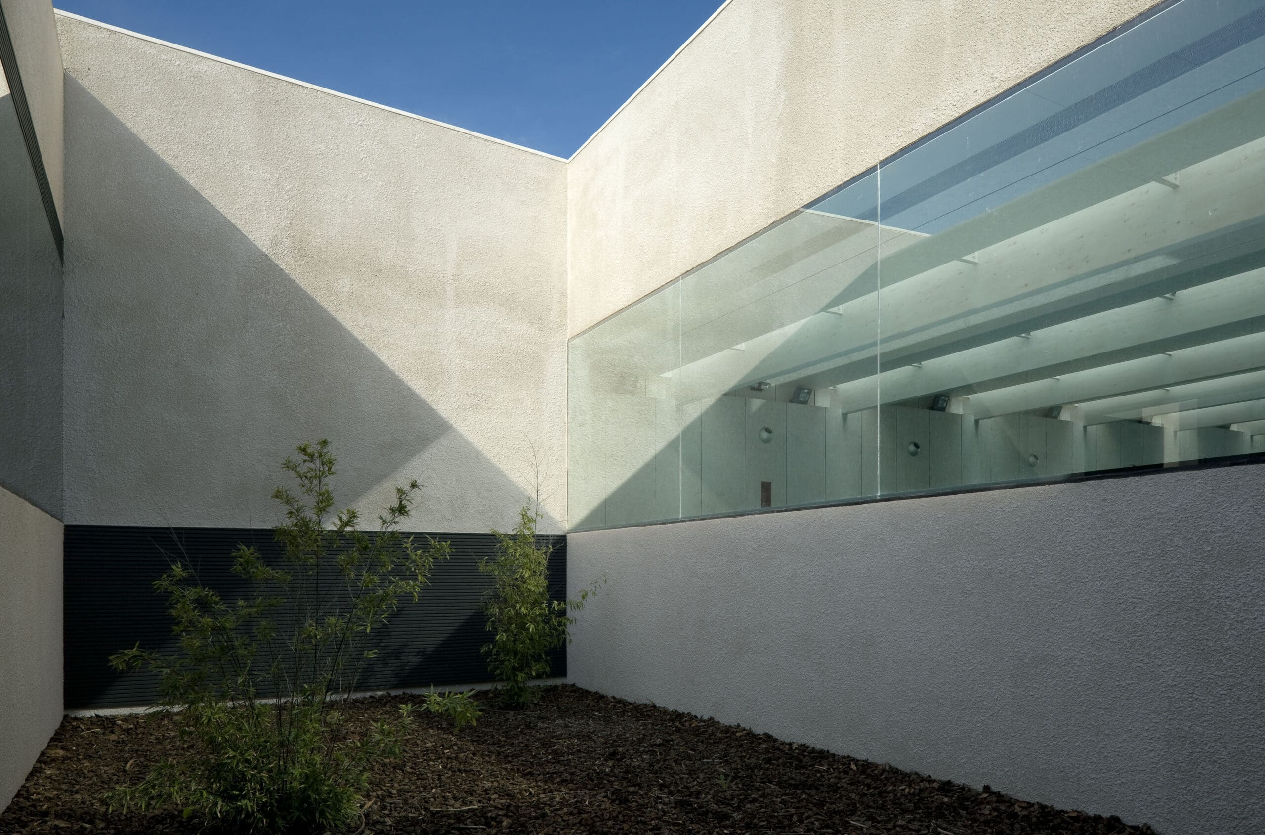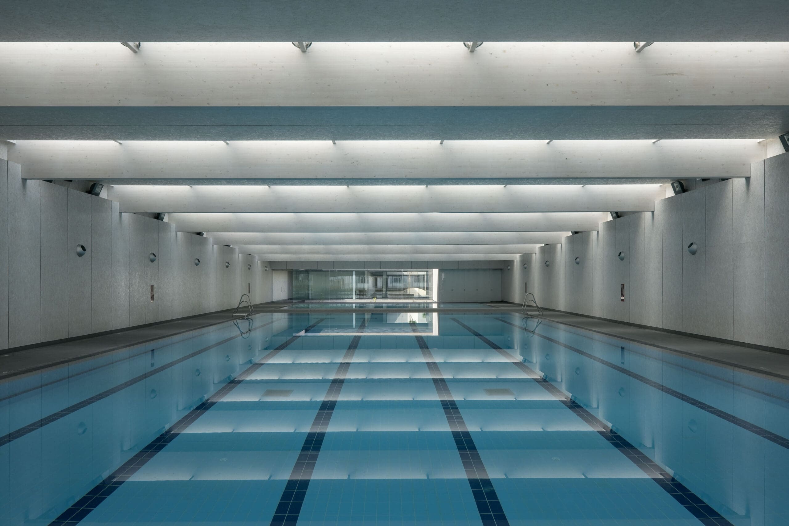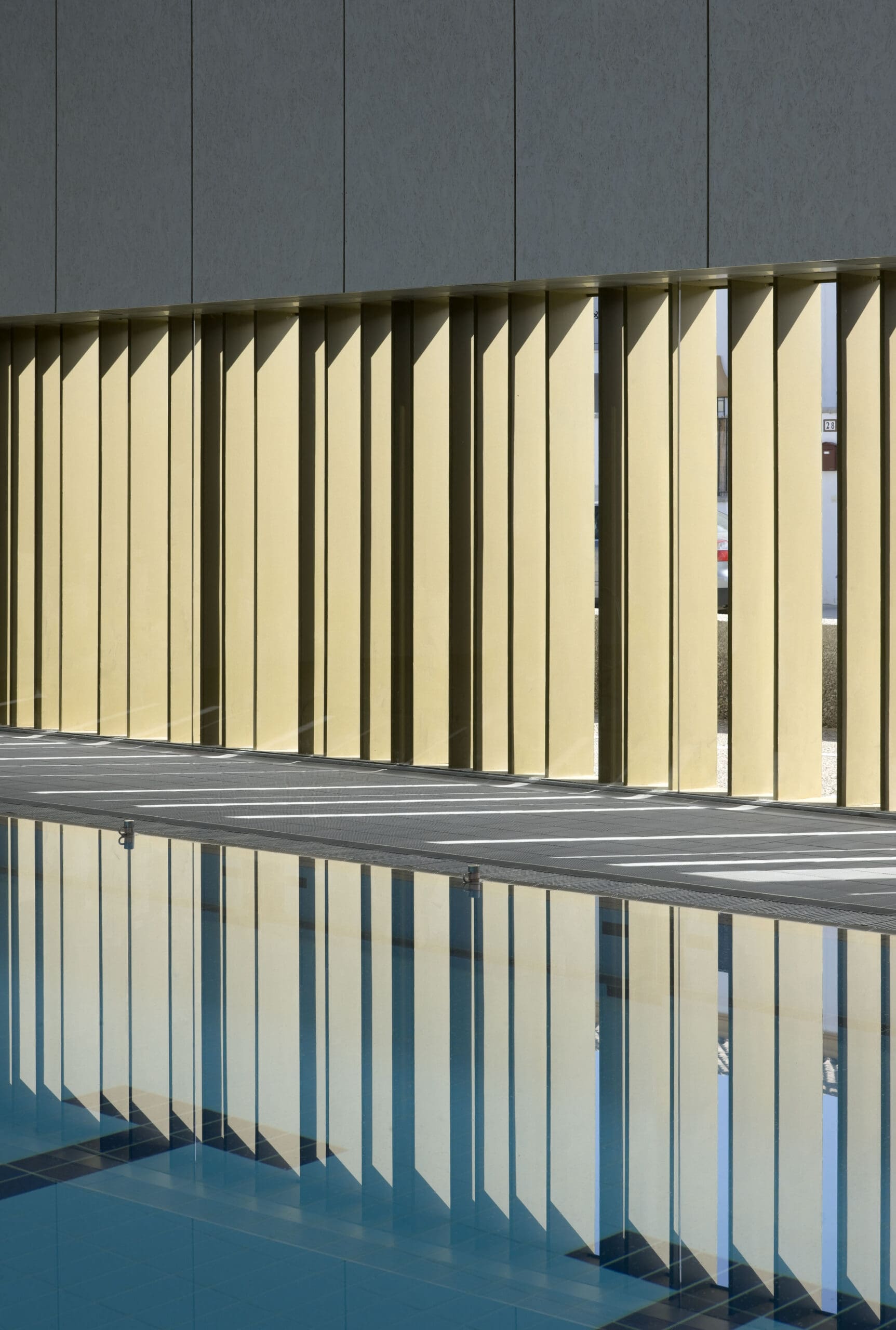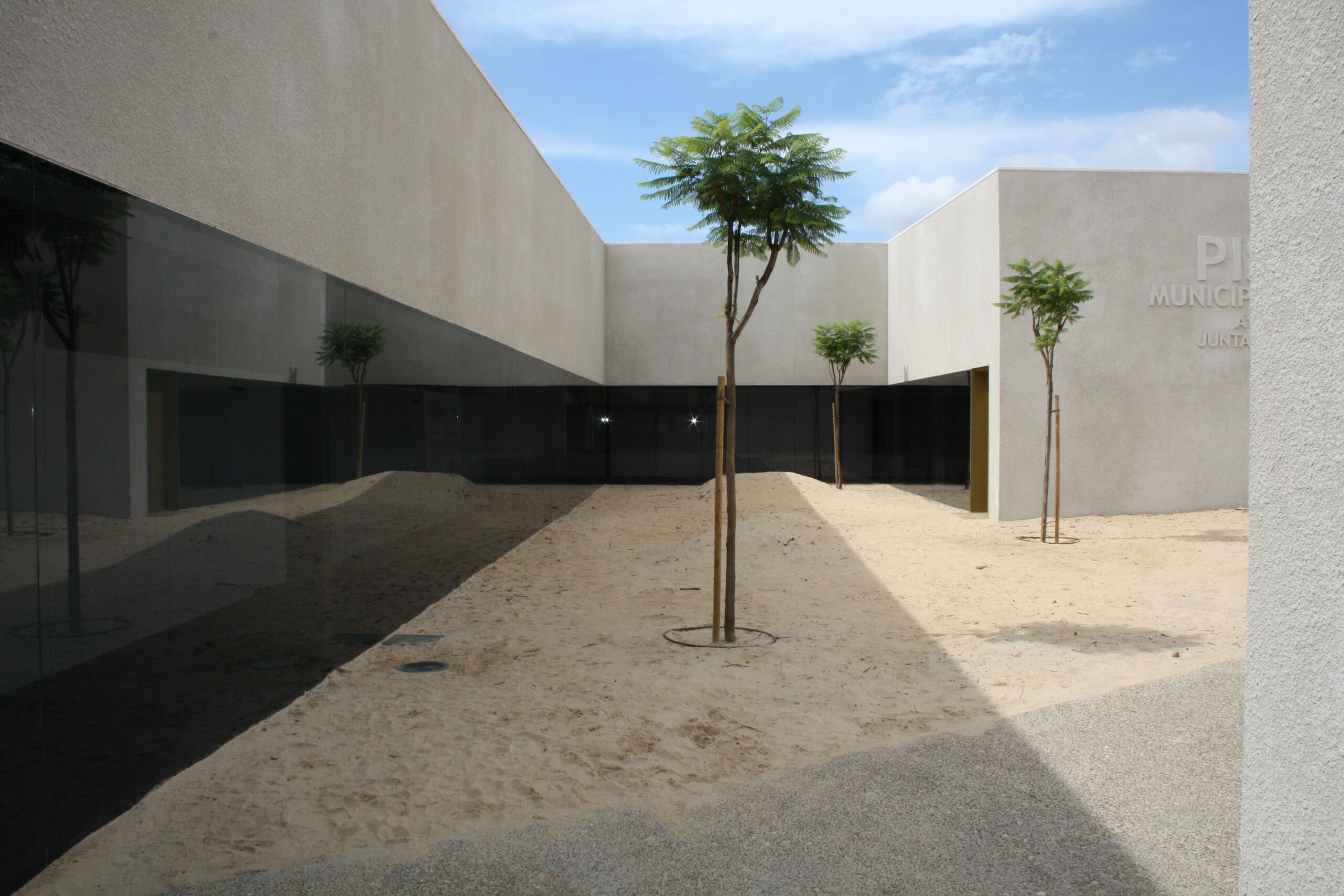 Las diversas funciones del programa giran en torno a la primera zona de acceso y control, optimizando sus recorridos y áreas de transición. Las piezas edificadas están diseñadas con diferentes grados de permeabilidad e intimidad, permitiendo disposiciones generosas y registros para el conjunto. En el extremo Oeste se encuentran los vestuarios, administración, control y una sala deportiva, organizados alrededor del vestíbulo y un patio que filtra y proyecta hacia el exterior. En el lado Este, se ubica el volumen de las piscinas, concebido como un espacio diáfano iluminado con la calidez de sus paredes y vigas blancas, que permiten acoger las amplias luces del pabellón.