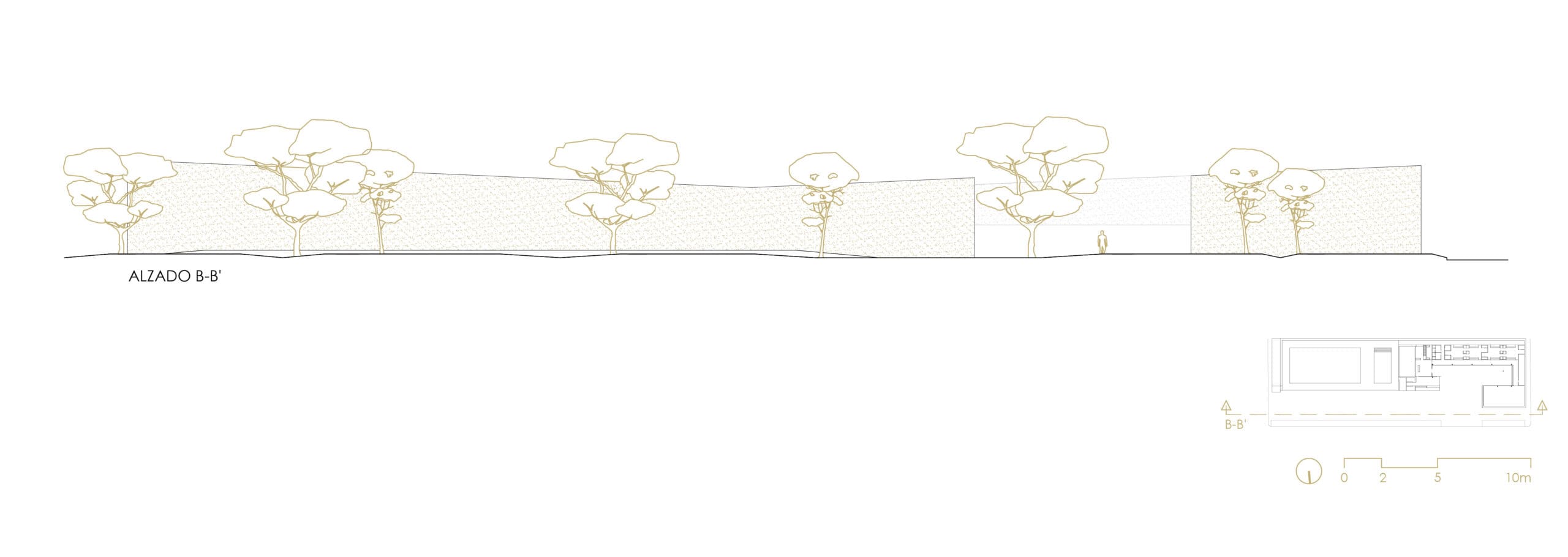 El acceso acota el espacio de llegada, configurándolo como un pequeño espacio público, con un carácter más íntimo para el desarrollo de actividades. La transición entre el acceso y el edificio se logra con una oquedad en el volumen que se oculta desde el interior, pero que facilita el ingreso con más naturalidad. La zona arbolada con pequeñas dunas cambiantes da continuidad al vacío interior, aportando identidad al carácter público y abierto del edificio en armonía con el entorno natural.