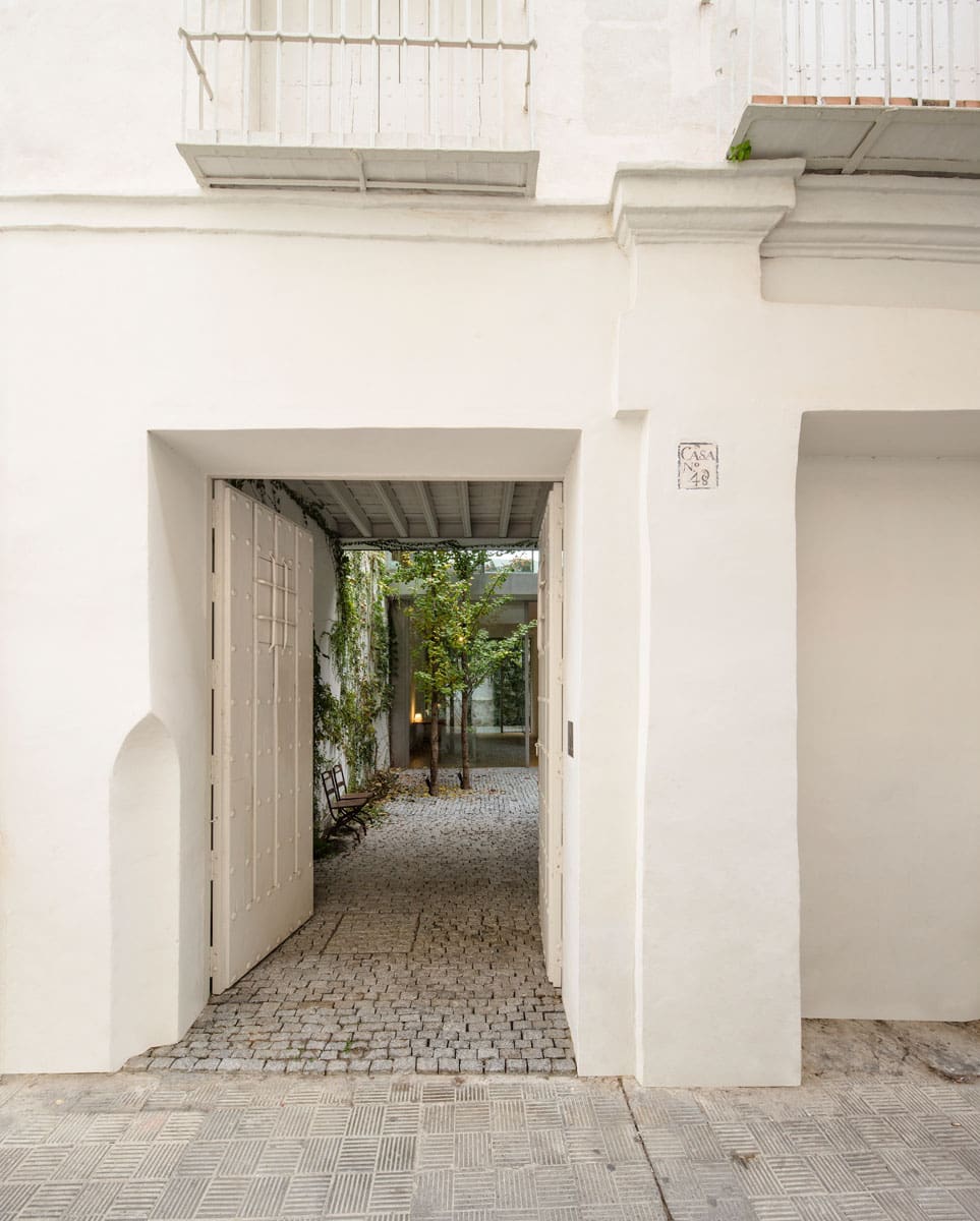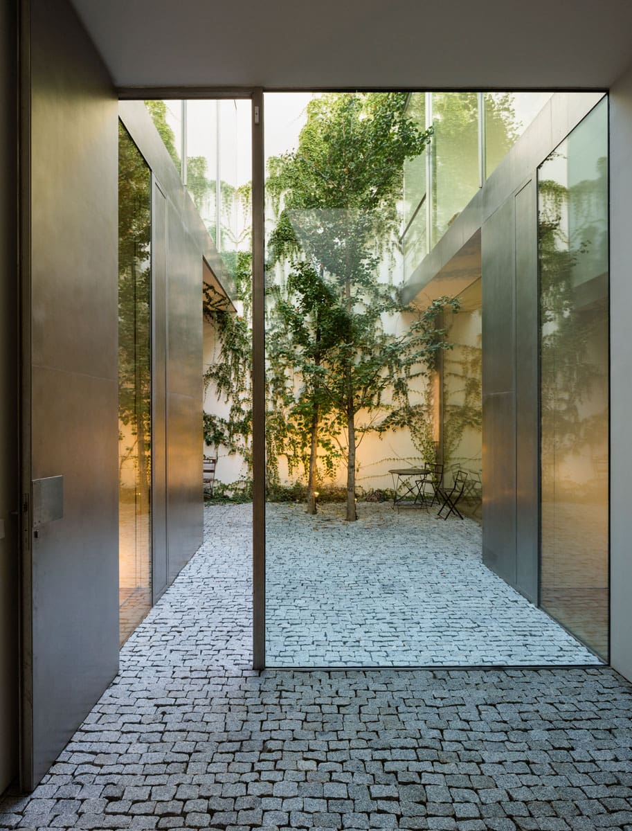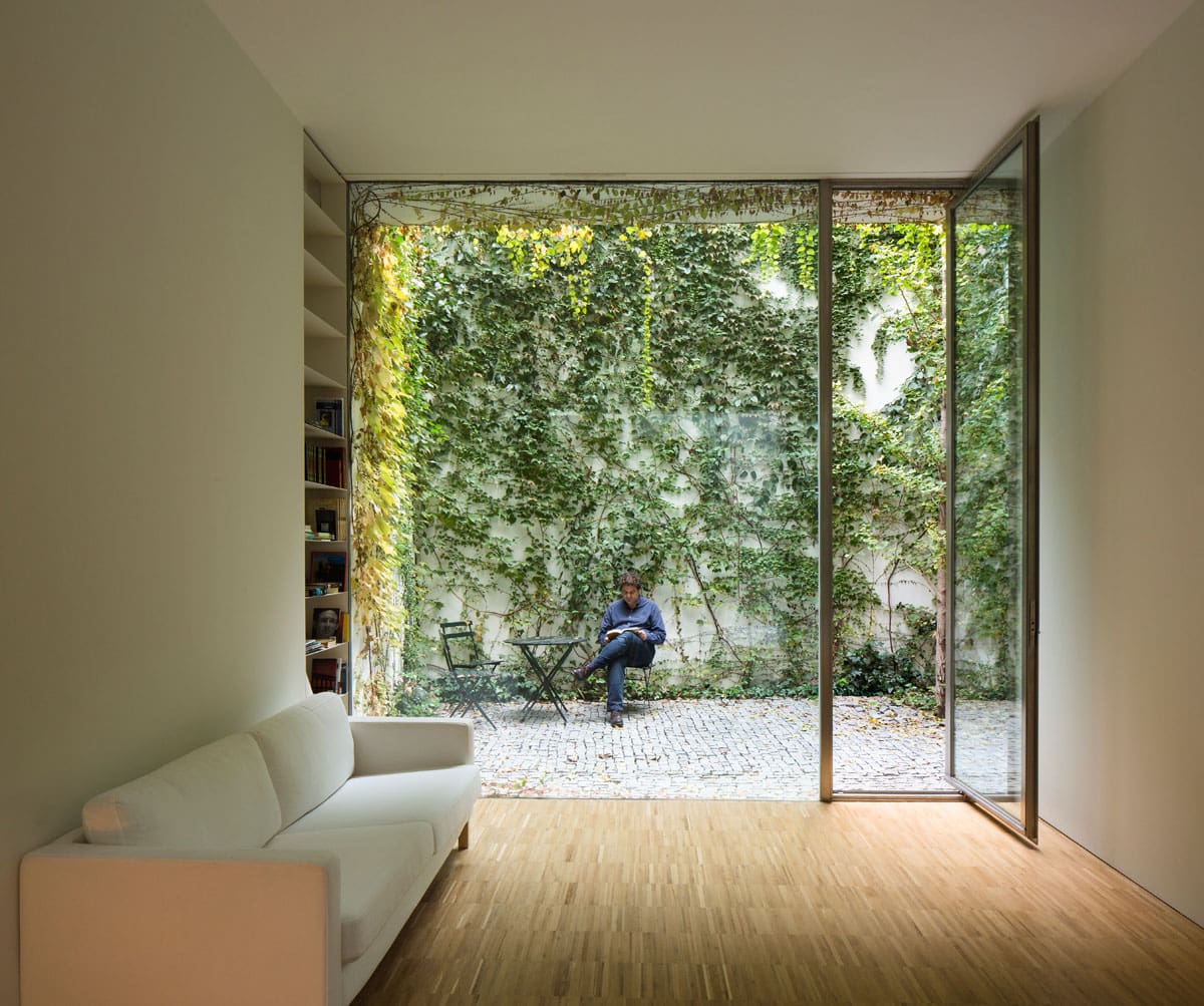 La anterior compartimentación se sustituye por espacios más diáfanos donde la naturaleza se funde con el carácter histórico de la primera crujía y con la contemporaneidad de las siguientes dos piezas de volúmenes nítidos, concebidos como contenedores de aire y luz. Para ello se diluye el primer muro interno con un largo cargadero que sostiene el forjado de madera y se cierran los nuevos patios con pieles transparentes que difuminan sus límites.