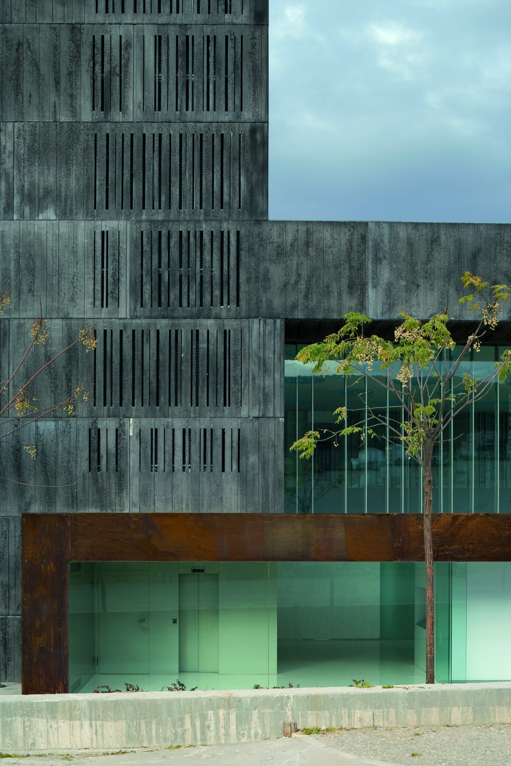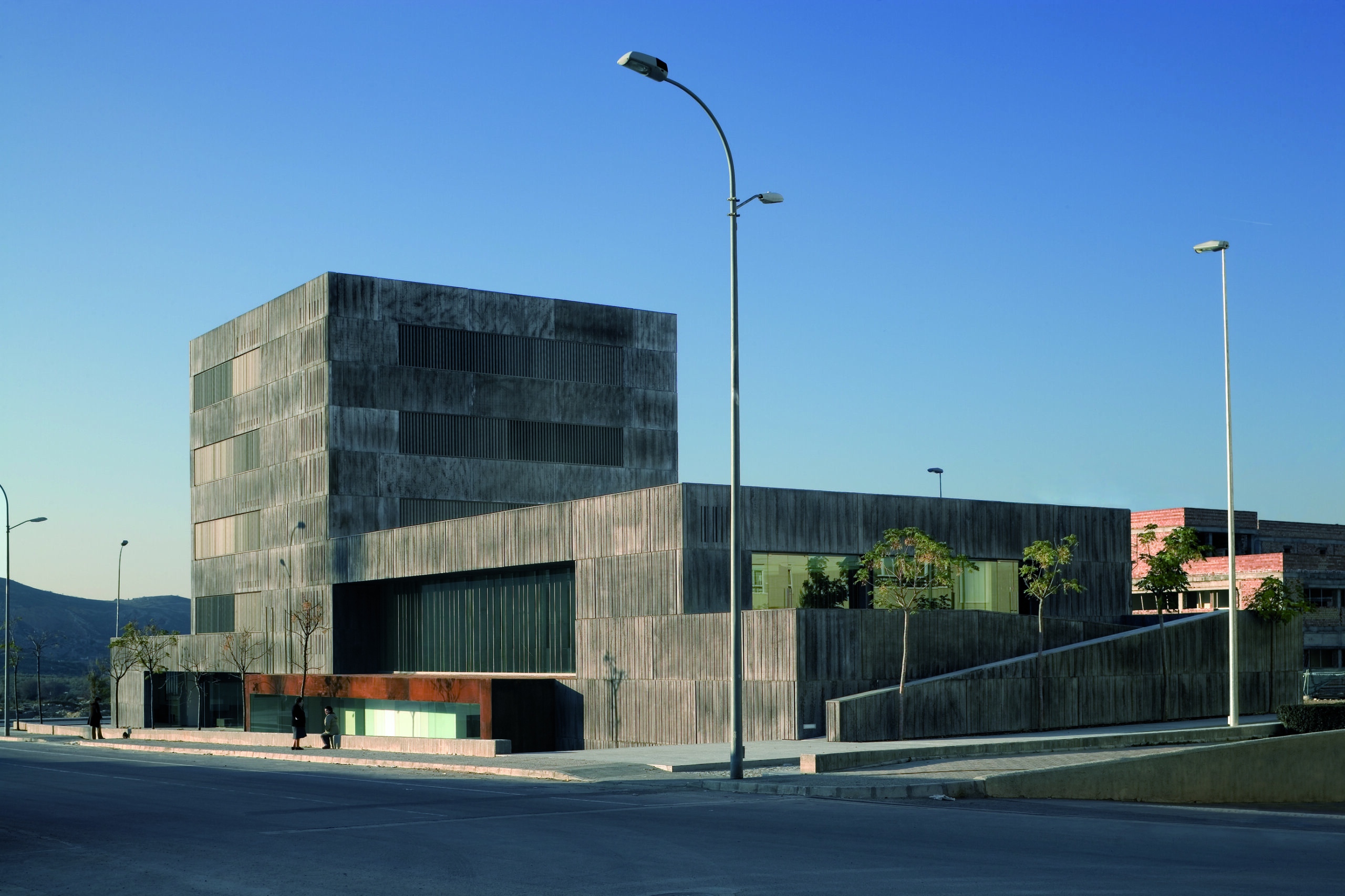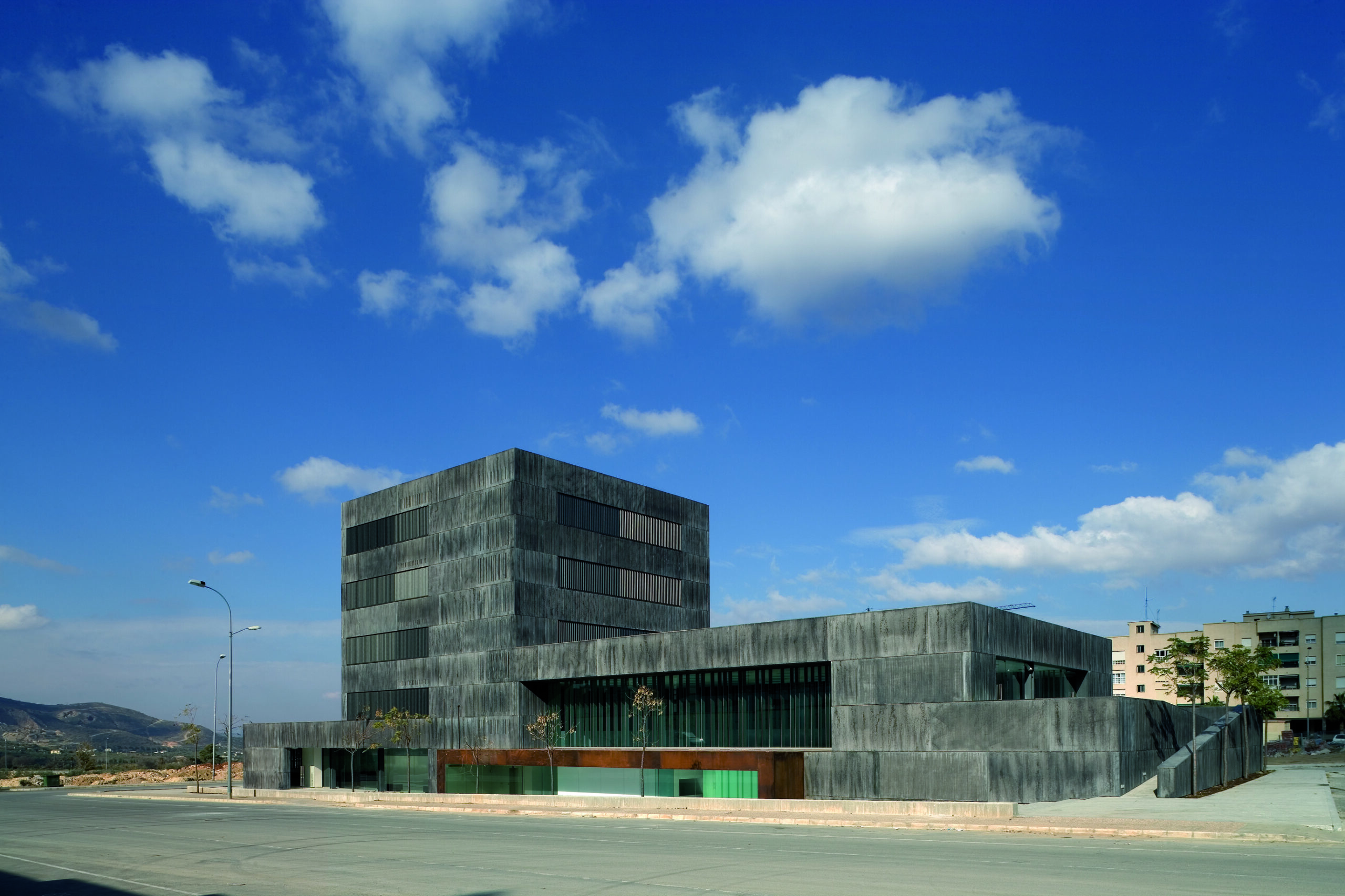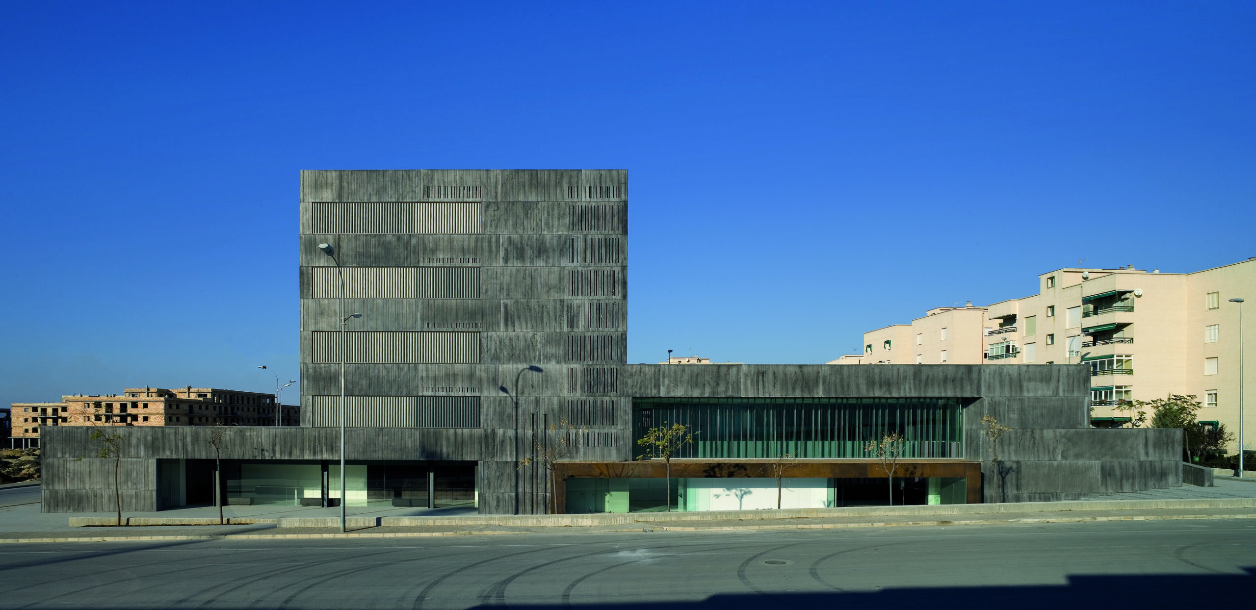 La elección del material y tonalidad de la fachada pretenden transmitir un importante grado de solidez. Se usa como material principal paneles prefabricados de hormigón reforzados con fibra de vidrio (GRC) con un acabado superficial, realizado sobre un molde estriado discontinuo en profundidad y separación que permite ocultar las juntas verticales entre paneles. Este sistema consigue dar el efecto de volumen monolítico, solo perforado por profundos y amplios huecos.