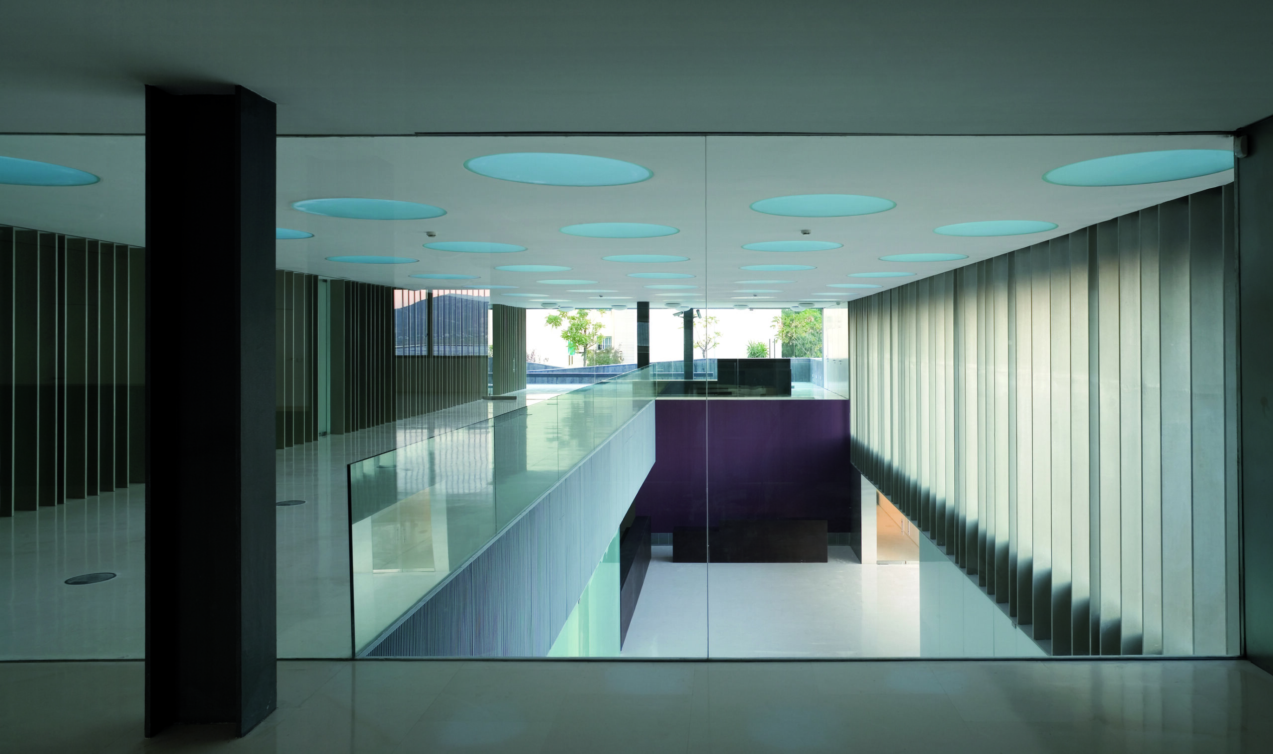 El volumen acoge un prisma longitudinal que se eleva sobre una gran plataforma, emergiendo una torre como elemento icónico. La entrada principal, a través de un vestíbulo de doble altura, revela la dimensión pública del edificio, mientras que los pequeños elementos de articulación y control segregan las circulaciones entre las áreas. De este modo, los usos vinculados al público general se ubican en planta baja y primera, mientras que la pieza vertical que alberga las estancias judiciales se erige a partir del segundo nivel. Bajo el nivel del suelo, se dispone el programa destinado a instalaciones, archivos y detenidos.